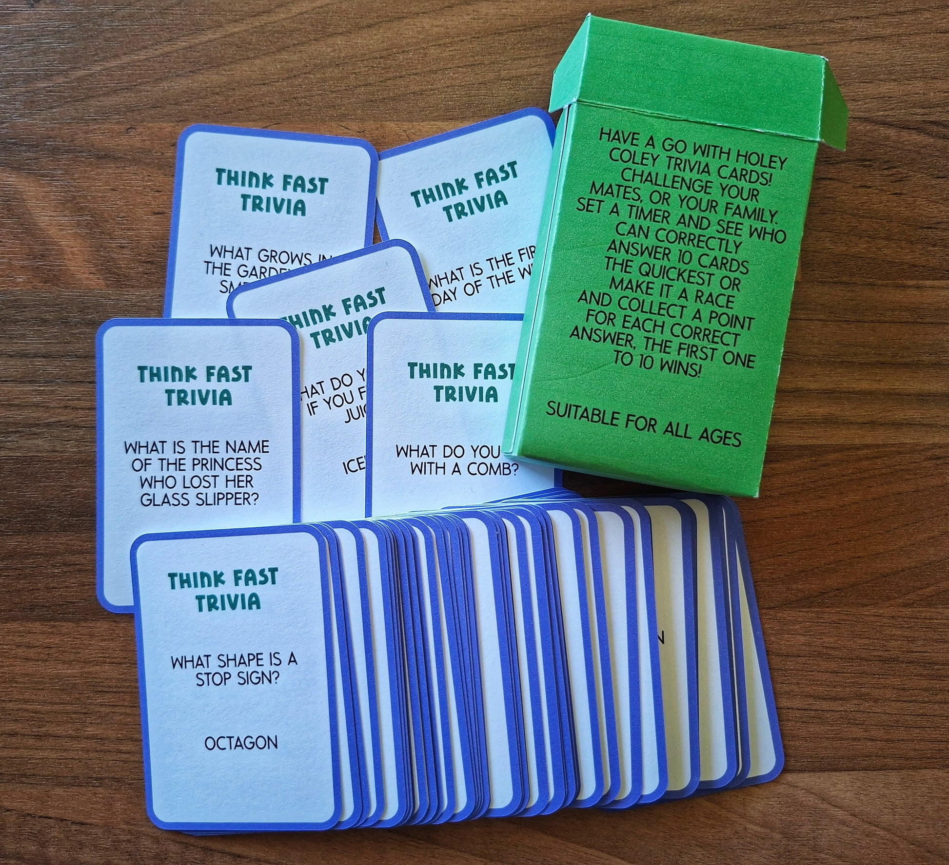 Think fast and have a blast with Think Fast Trivia! This family-friendly game will test your speed and wit with easy questions that can trip you up if you're not quick enough. Perfect for all ages, whether as a family game or part of game night. (Oh, and it's also great for deciding who has to do dishes! ?)